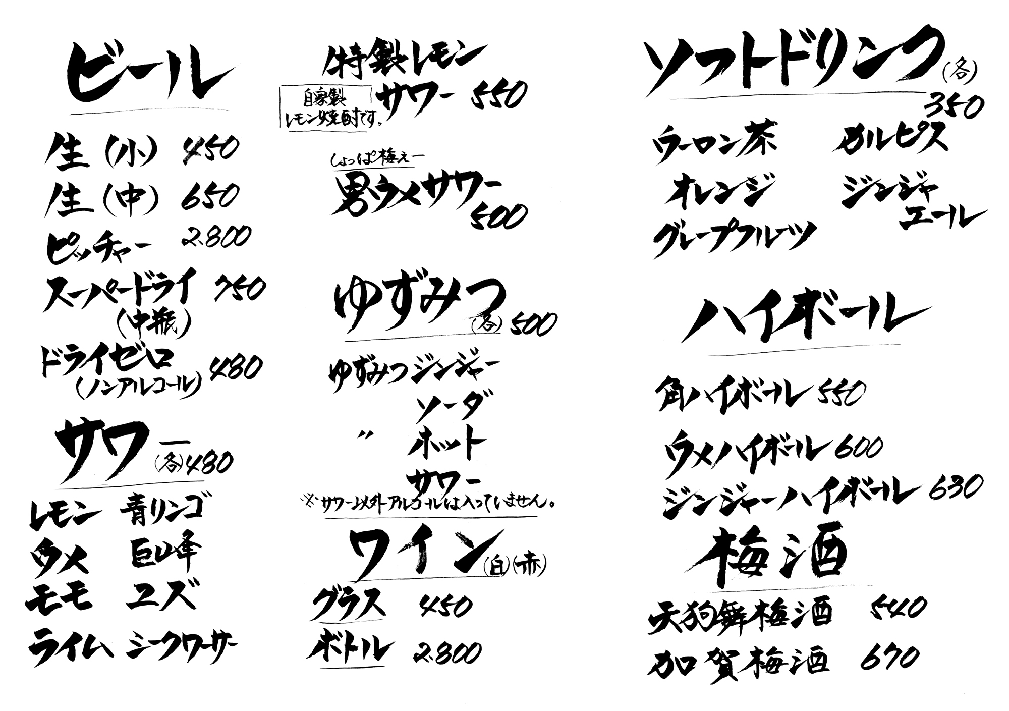 その他、ビール・サワー・ワイン・カクテル・梅酒・ソフトドリンクなど、豊富にご用意しております。