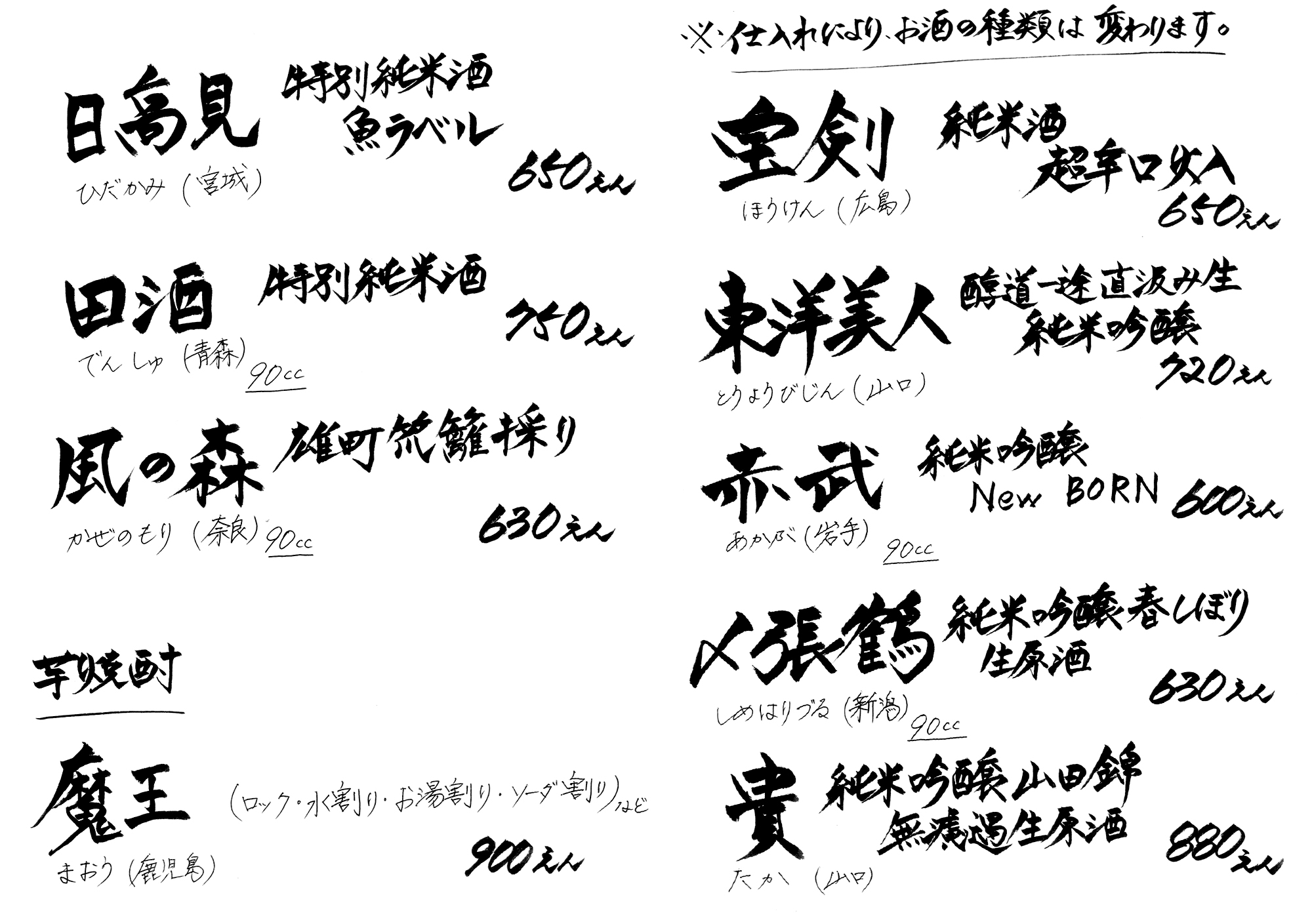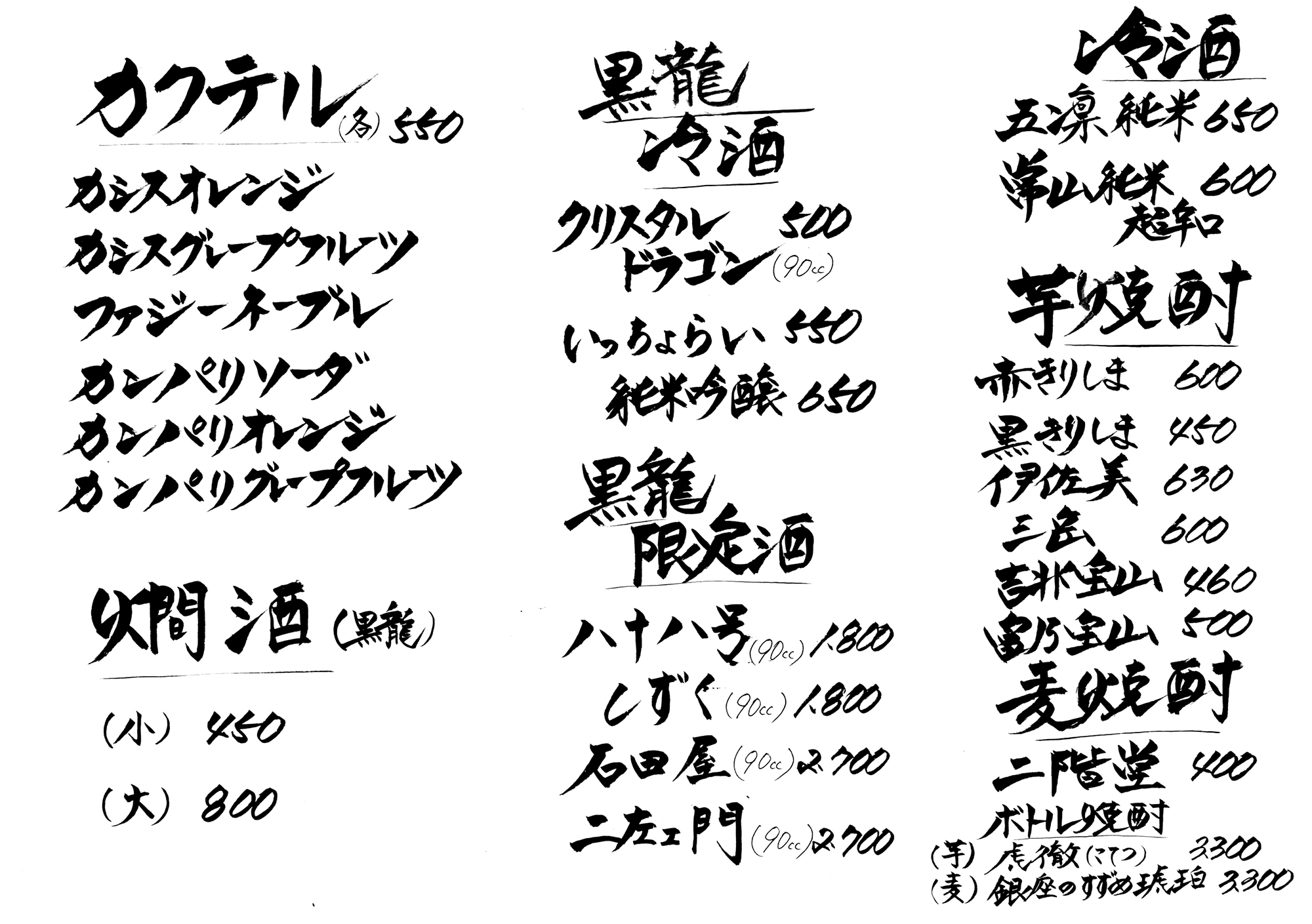 焼酎は、芋・麦・黒糖・泡盛のこだわりの本格焼酎を取りそろえております。日本酒は黒龍(福井県)をフルラインナップ取りそろえ、入手困難の石田屋・二左衛門・しずく・八十八号も季節限定で入荷します。